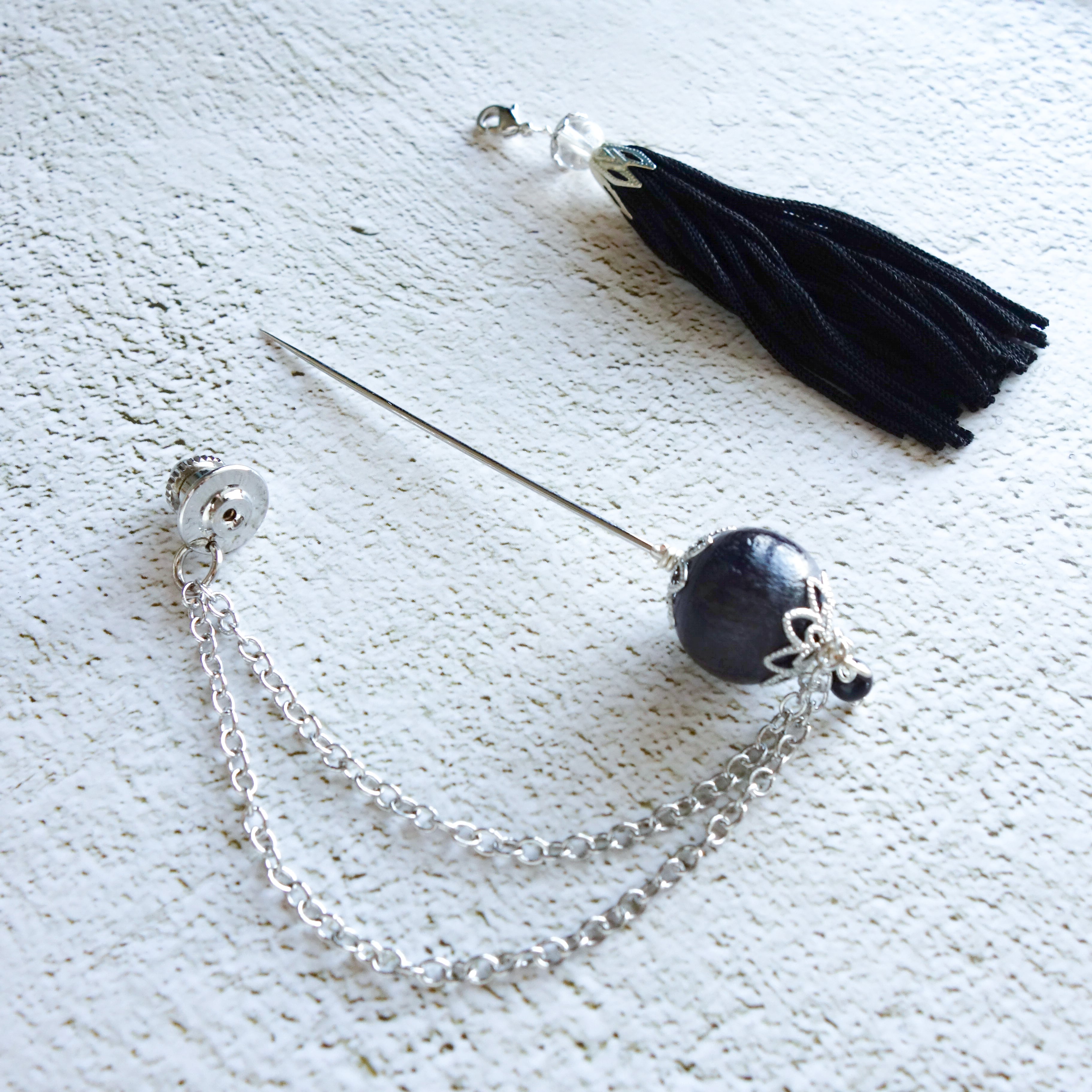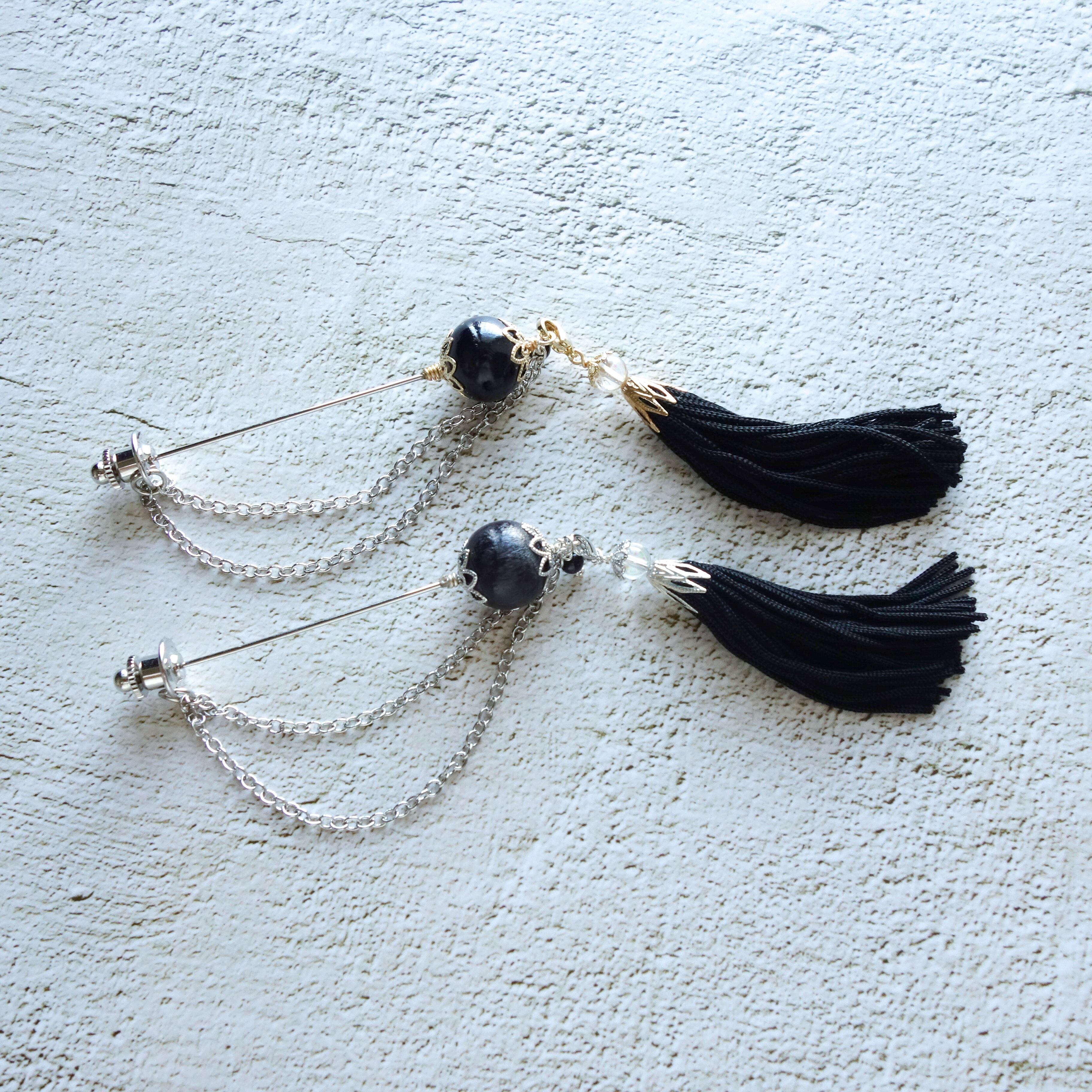 細めの先端をホールドできるよう、選び抜いた国産のキャッチを使用しました。タッセルは取り外し可能なのでシンプルにも使えます。