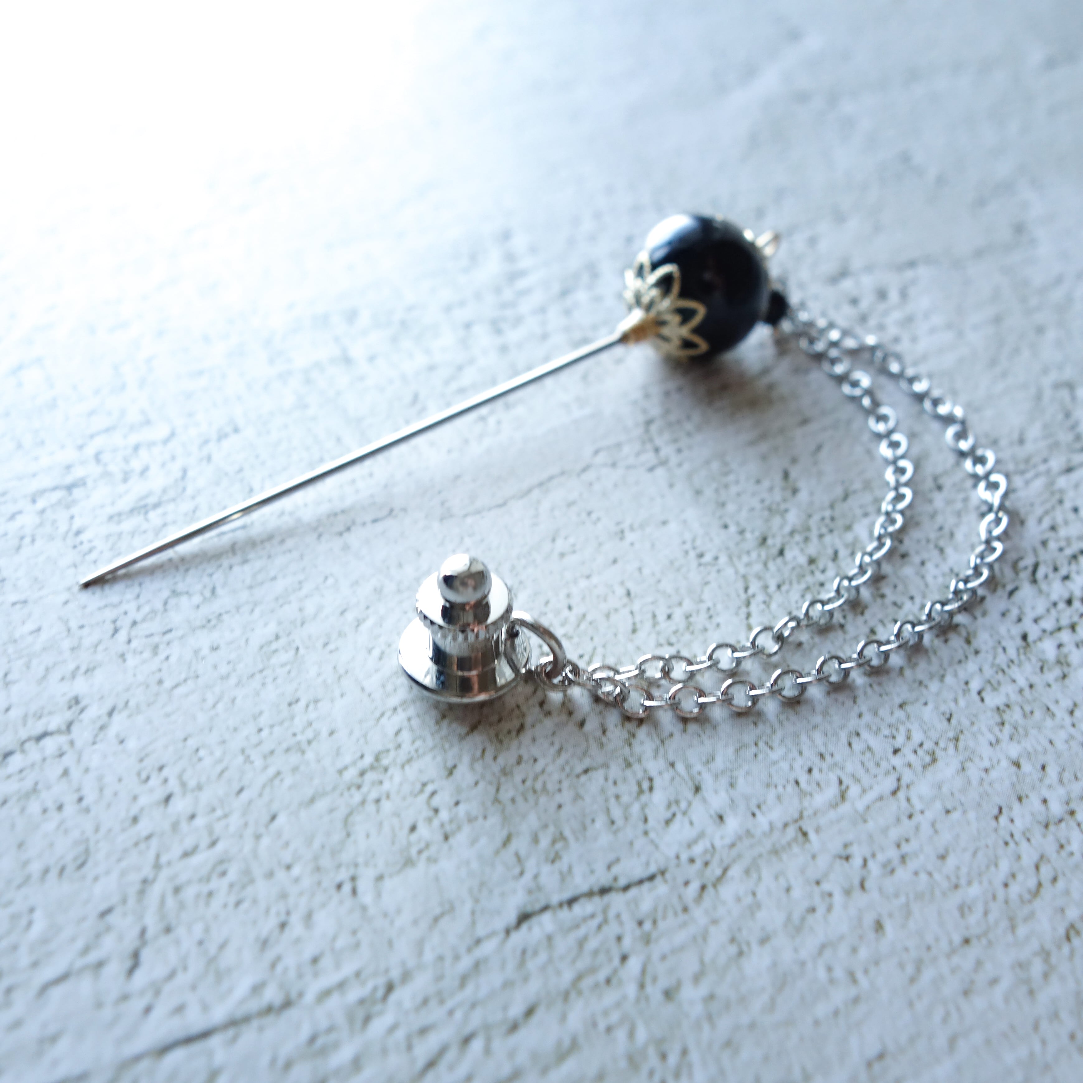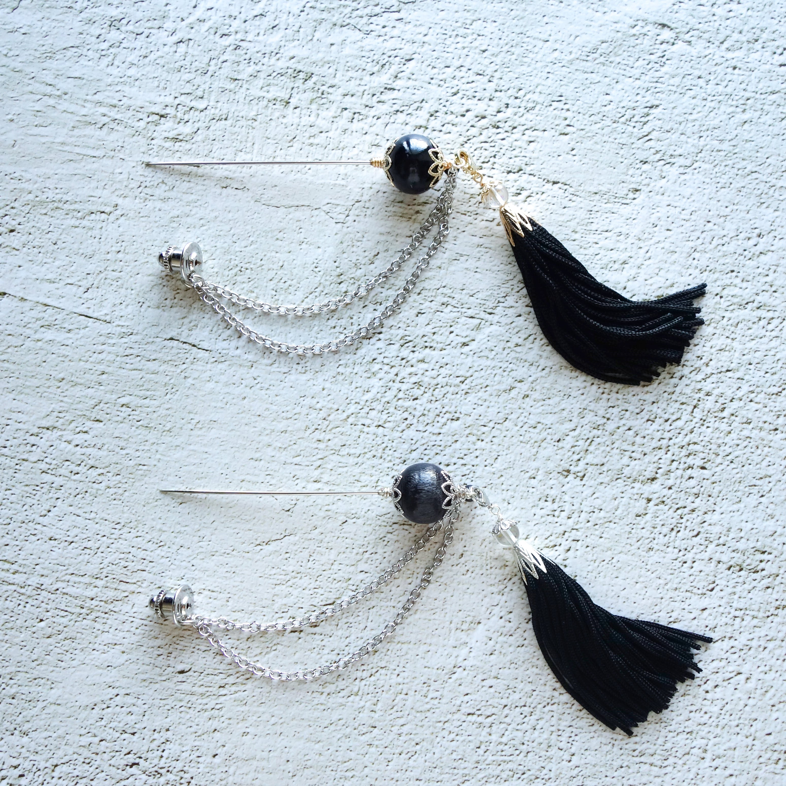 ゴールドは座金、カニカンなどをゴールドカラーで組み、シルバーはそれぞれシルバーカラーで組んであります。ブラックオニキスつきです。