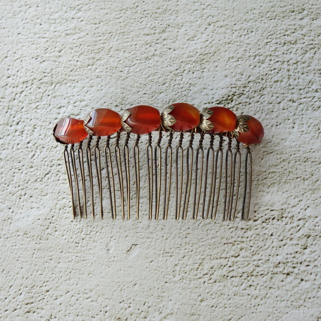 アンティークカラーの金属櫛に赤瑪瑙と透かし飾りをあしらった華やかなコームタイプ簪です。