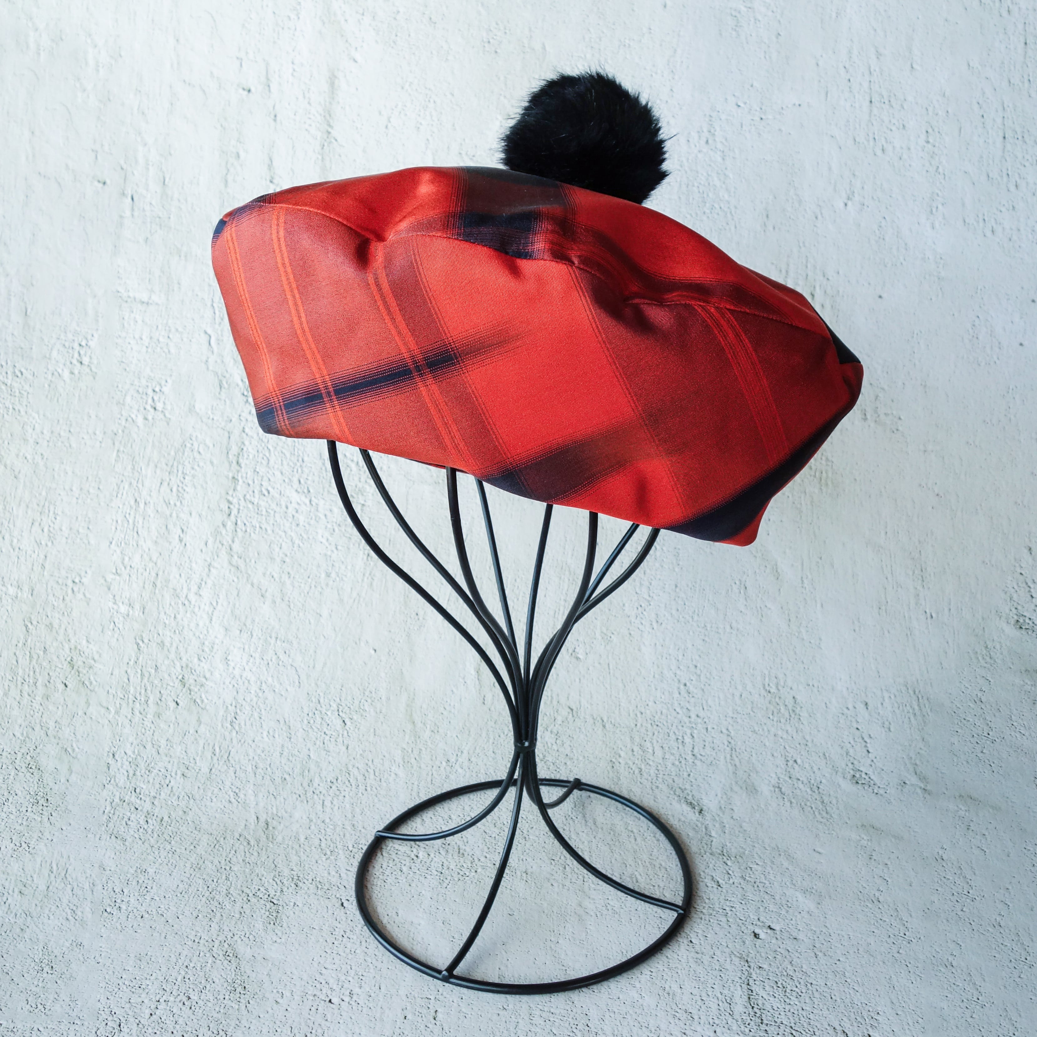 光沢とハリが美しい絹100%の手ぐくりかすり格子着物反物で作ったベレータイプの帽子です。トップに組紐とタッセルの飾り、ポンポンファーをあしらい、和装とも個性的にマッチします。