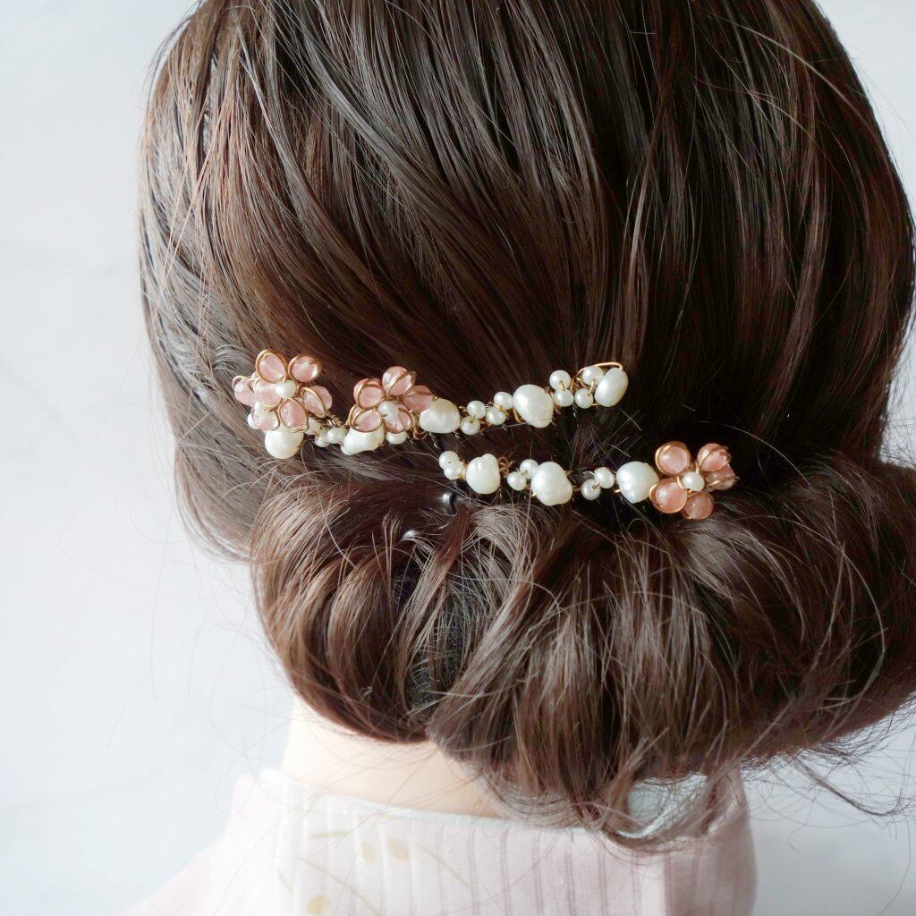 淡水パールとカットタイプのローズクウォーツを桜に見立て、アンティークカラーのワイヤーワークでまとめた2本軸&コームのコンビ簪です。